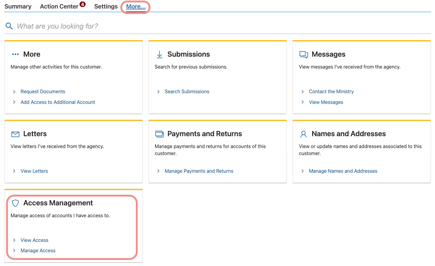 Navigate to “More” in the top menu bar and look for the “Access Management” panel.
